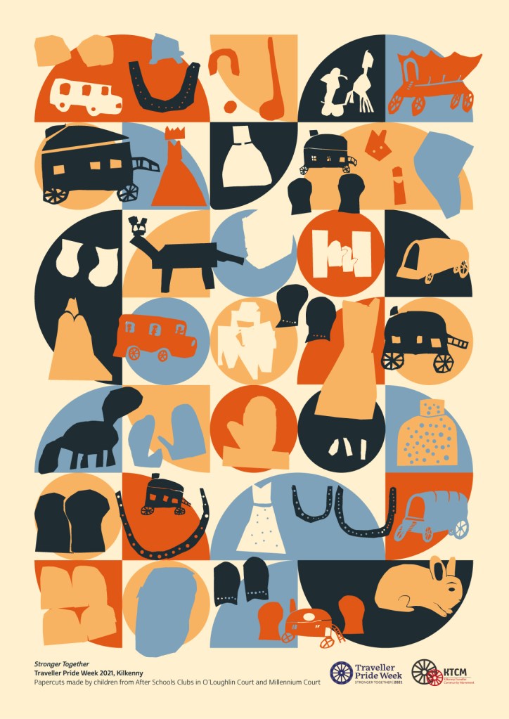 Today is the last day of Traveller Pride Week 2021. On Tuesday Hannah McCormick and I facilitated papercutting workshops in after school clubs in O’Loughlin Court and Millennium Court in Kilkenny. I designed an A3 poster based on the work made by the children and on Friday they all received a printed copy.