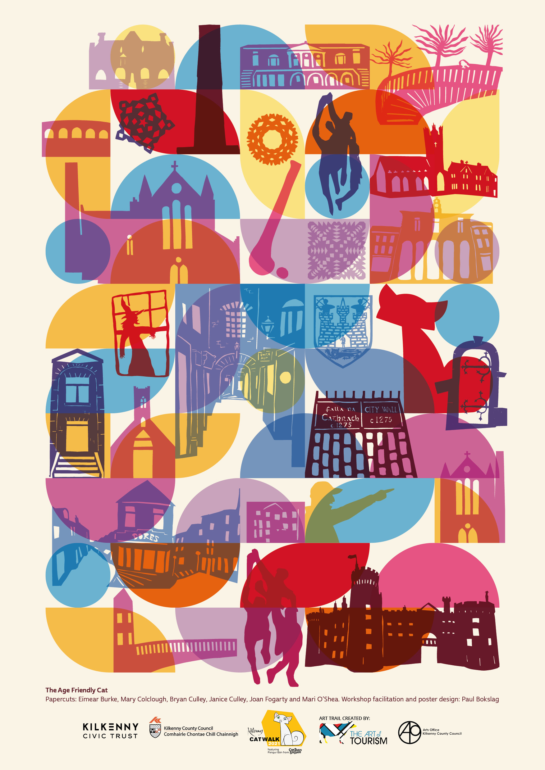 In the spring of 2021 I ran a number of papercutting workshops on Zoom, in preparation for painting ‘the Age Friendly Cat’. Wonderful Kilkenny-themed work was made by workshop participants Eimear Burke, Mary Colclough, Bryan Culley, Janice Culley, Joan Fogarty and Mari O’Shea. As a memento, I designed an A3 poster that includes most of the papercuts made by them, showing much more of their detail than the cat does. High quality digital prints by Modern Printers. The Kilkenny Catwalk trail of 21 sculptures continues until Easter 2022. ‘The Age Friendly Cat’ can still be found in McDonagh Junction’s square. Visit www.kilkennycatwalk.ie to find out more.